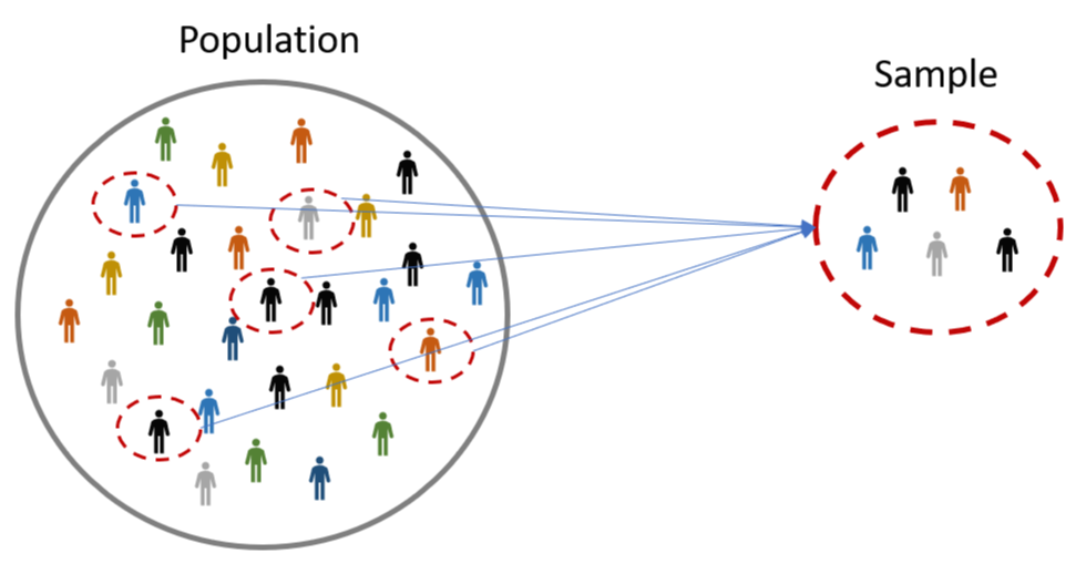 - Sample (표본): a set of individuals selected from a population (과학적인 절차를 적용하여 모집단을 대표할 수 있는 일부를 추출하여 직접적인 조사 대상이 된 모집단의 일부